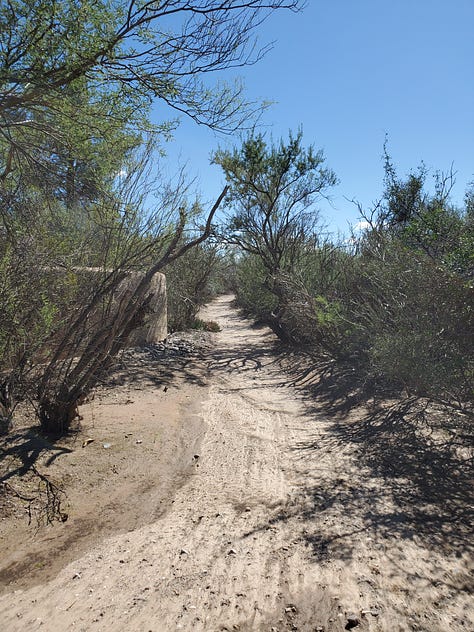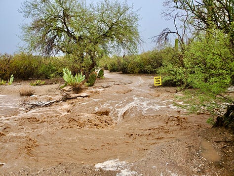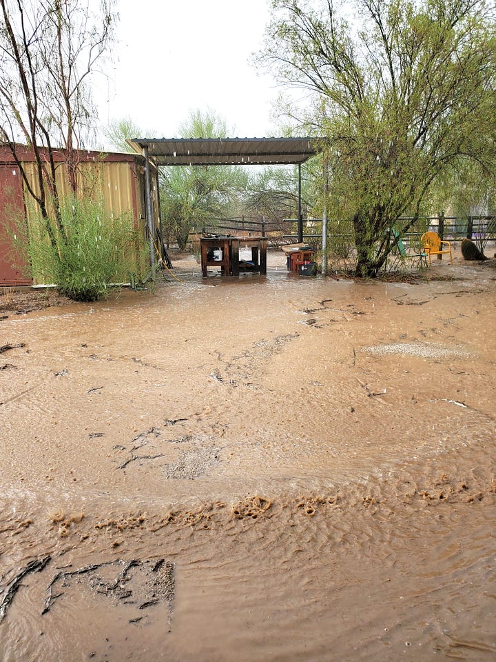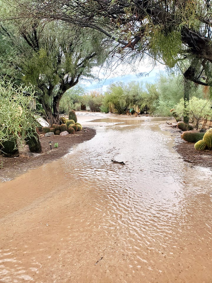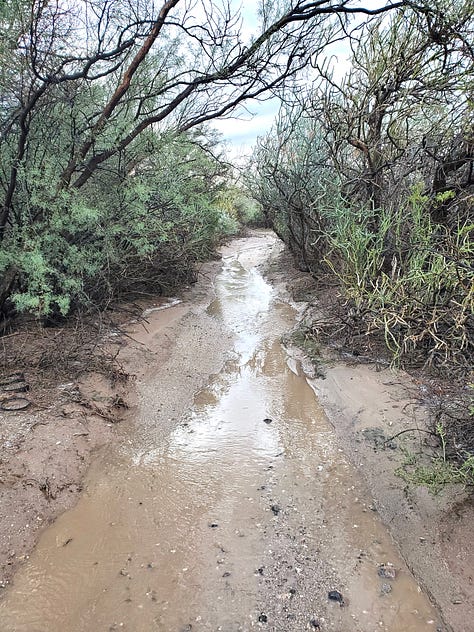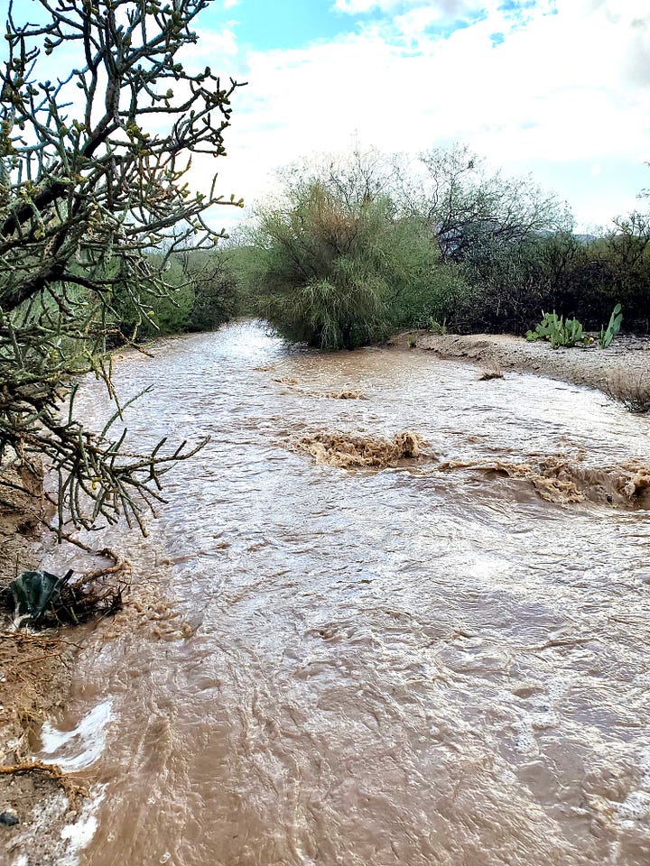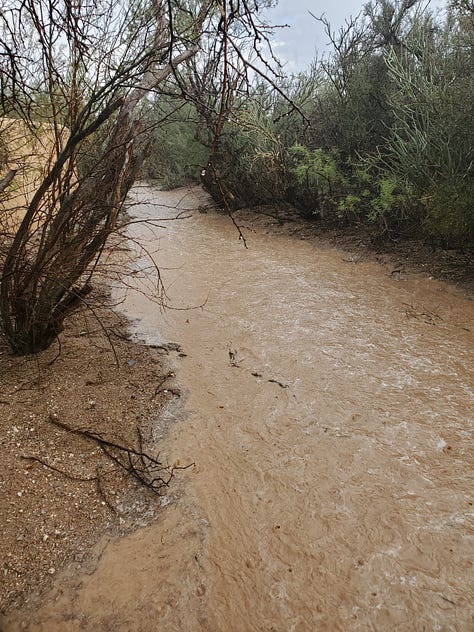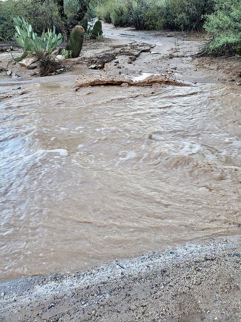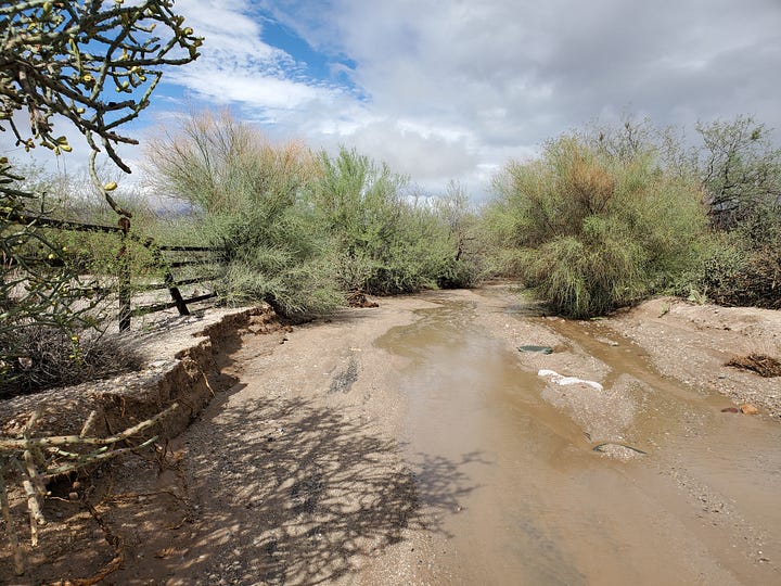 These are photos of the wash heading north. Both photos were taken on the same day, a few hours apart. It is completely dry today. I didn’t take photos today cuz he was digging it up to repair the road. The palo verde on the right with some dead in the middle will help orient you.