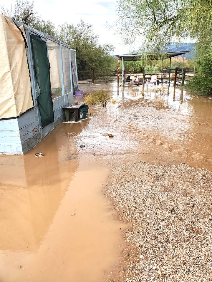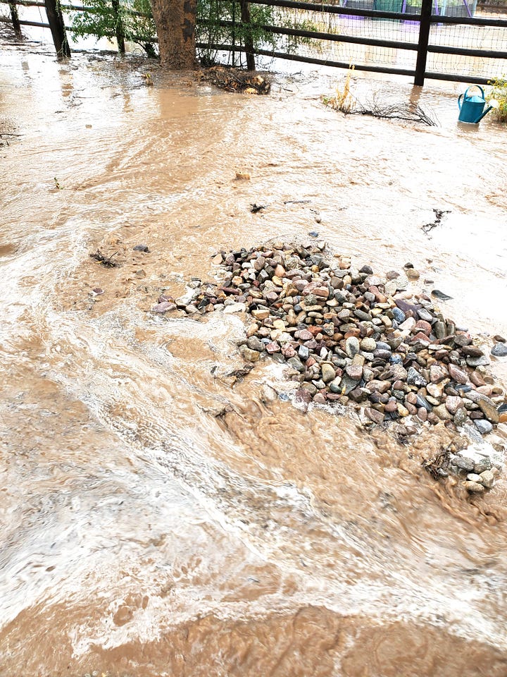 In the photo with the water and the gardens below, the water had already started to go down. It was completely surrounding the gardens and 4-6 inches deep. In the second photo, that’s today. All dry. (And I finally took down the shade cloth.)